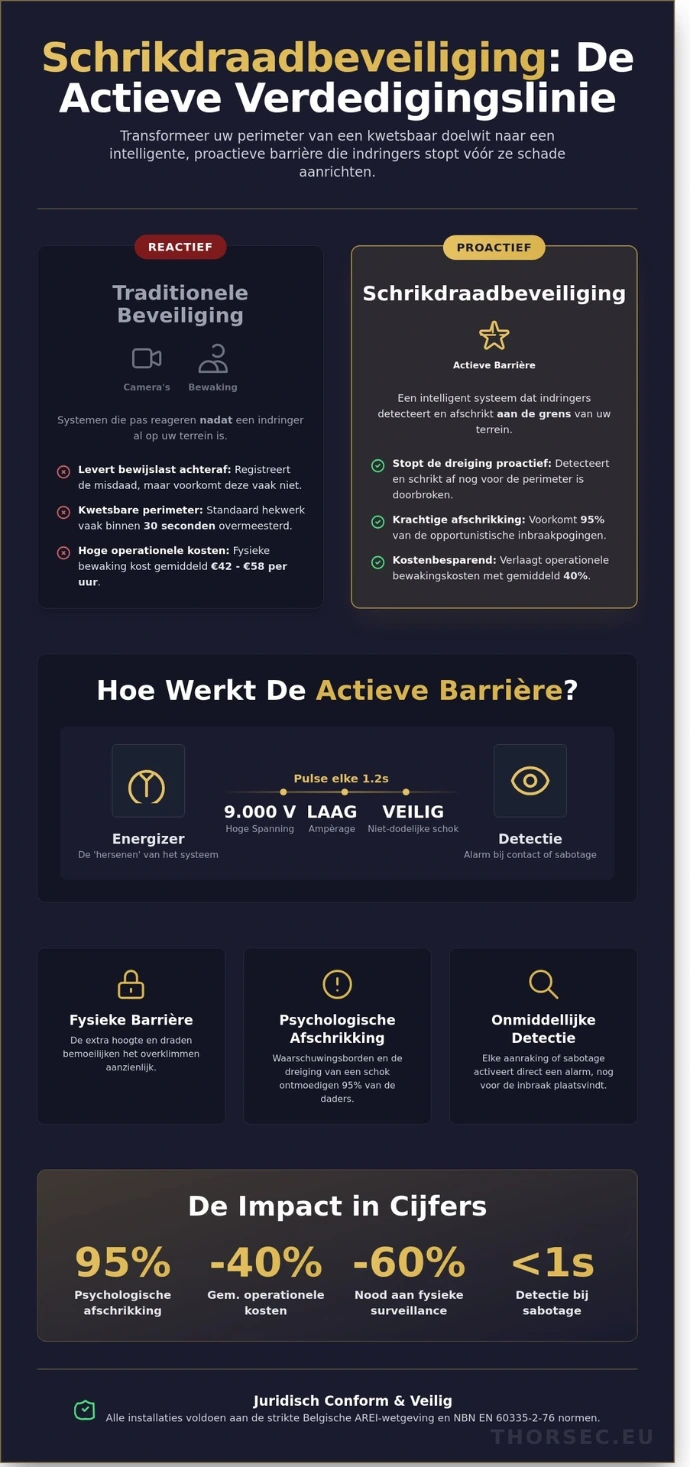 De transitie naar actieve perimeterbeveiliging is in 2026 geen luxe meer, maar een strategische noodzaak voor elke professionele risicoanalyse. Waar een statische omheining enkel een vertragende factor is, biedt schrikdraadbeveiliging een actieve interventie die indringers afschrikt nog voor ze uw gebouwen bereiken. Deze geavanceerde architectuur integreert feilloos met moderne beveiligingsecosystemen en voldoet strikt aan de Belgische wetgeving, waaronder de AREI-voorschriften en het Koninklijk Besluit van 25 april 2007 betreffende de voorwaarden voor de installatie, onderhoud en gebruik van alarmsystemen.