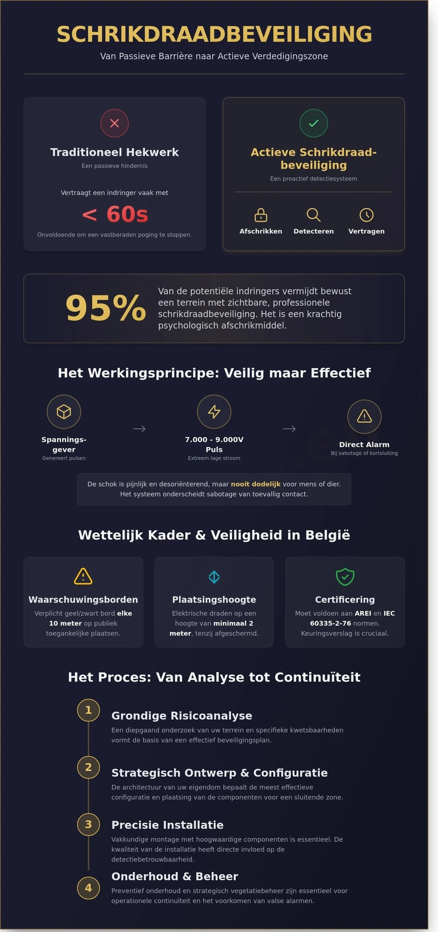 Een traditioneel hekwerk stopt geen vastberaden indringer, het vertraagt de ongeoorloofde toegang in de praktijk vaak met minder dan 60 seconden. U erkent waarschijnlijk dat passieve beveiliging alleen niet langer volstaat om uw fysieke activa te beschermen tegen moderne risico's. Toch zorgen de complexe Belgische regelgeving en de vrees voor onnodige alarmmeldingen door omgevingsfactoren vaak voor aarzeling bij het upgraden van uw buitenbeveiliging. In dit artikel ontdekt u hoe een strategische schrikdraadbeveiliging uw eigendom transformeert van een statisch object naar een actieve, intelligente beveiligingszone die indringers detecteert nog voordat ze uw terrein betreden.